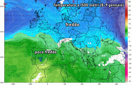 Lunedì 9 gennaio: maltempo sulle regioni tirreniche e al nord. Piogge a tratti di moderata entità e neve in montagna oltre 1500 metri. Possibile lento guasto anche al sud in giornata. Temperature in calo.