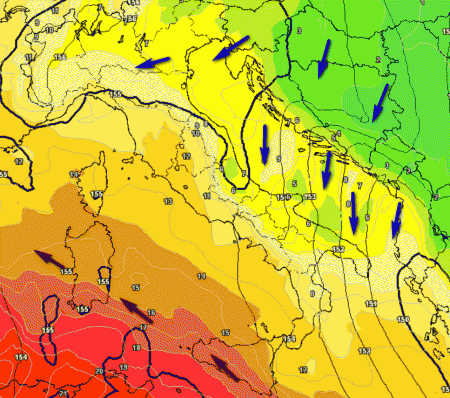 L’aria fresca dai Balcani che rientra da est nel Mediterraneo e provoca una temporanea flessione delle temperature tra questa sera e giovedì mattina al nord e lungo il versante adriatico, qui le temperature previste a 1500m all’alba di giovedì sull’Italia: