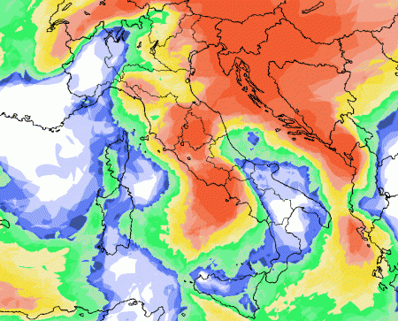 Probabilità di pioggia riferita alla mattinata di venerdì (in arancione possibilità vicina al 100% riguardo la caduta di almeno 5 mm di pioggia):
