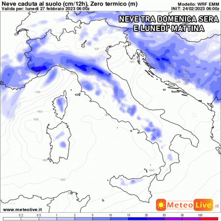 Lunedì 27 febbraio: nevicate al Nordovest in pianura o bassa collina, piovaschi al centro Italia e al sud, eccetto qualche forte acquazzone o temporale sull’arco ionico. Temperature in aumento al nord, stazionarie altrove.