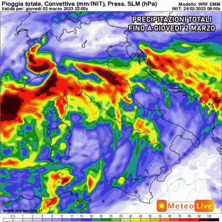 Sabato 25 febbraio: piogge sparse al nord e medio-alto Tirreno, stabile al sud con temperature pienamente primaverili (fino a 25°C!). Deciso peggioramento dalla sera su tutto il centro Italia. Temperature in forte aumento al centro e al sud.