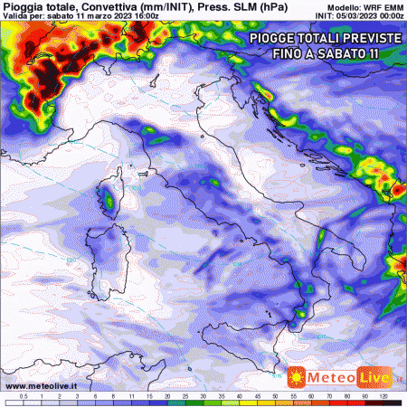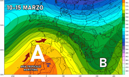 Tuttavia è bene chiarire che mancheranno grandi perturbazioni organizzate. Quindi non ci saranno piogge estese e persistenti su vaste aree della penisola, tutt’altro. Il fenomeno predominante sarà proprio il vento di libeccio, il quale soffierà con forza (oltre a 40-50 km/h di raffica) tra 7, 8 e 9 marzo.