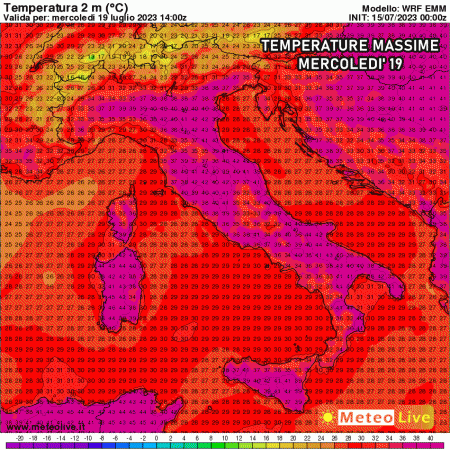 Mercoledì 19 Luglio: caldo esagerato da nord a sud. Punte di oltre 40°C al nord, fino a 42-44°C nelle zone interne del sud e delle isole. Possibili 45°C in Sardegna e Puglia settentrionale. Afa pesante e insopportabile di sera.