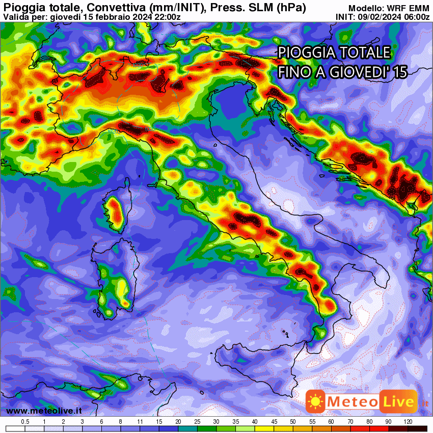 Sabato 10 febbraio: maltempo su tutto il nord e medio-alto Tirreno, isolati nubifragi a ridosso dei monti, neve in alta quota. Temperature in lieve calo. Burrascoso scirocco al sud, specie in Sicilia.