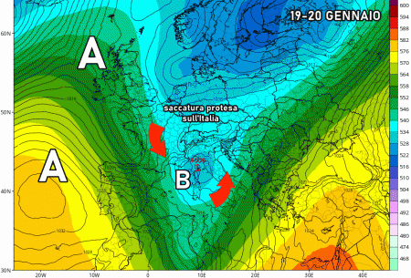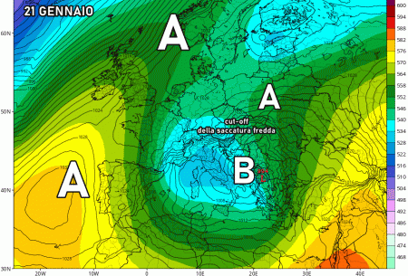 Sabato 21 gennaio: isolamento della saccatura fredda nel Mediterraneo e ancora tanto maltempo al centro e al sud. Nevicate abbondanti in Appennino.