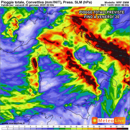 Venerdì 20 gennaio: precipitazioni residue al nordest, neve possibile in Emilia Romagna al piano. Maltempo insistente sul resto del centro e del sud con precipitazioni abbondanti sul lato tirrenico.