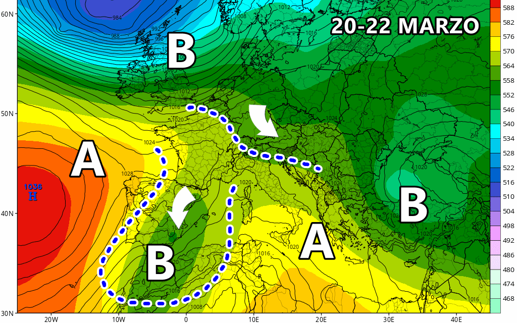 La situazione meteo per il post-Equinozio, insomma dal 20 marzo in poi, è ancora in alto mare ed estremamente inaffidabile. Il rischio, al momento, è quello di nuove veloci incursioni umide da nord in grado di generare piovaschi e locali temporali.
