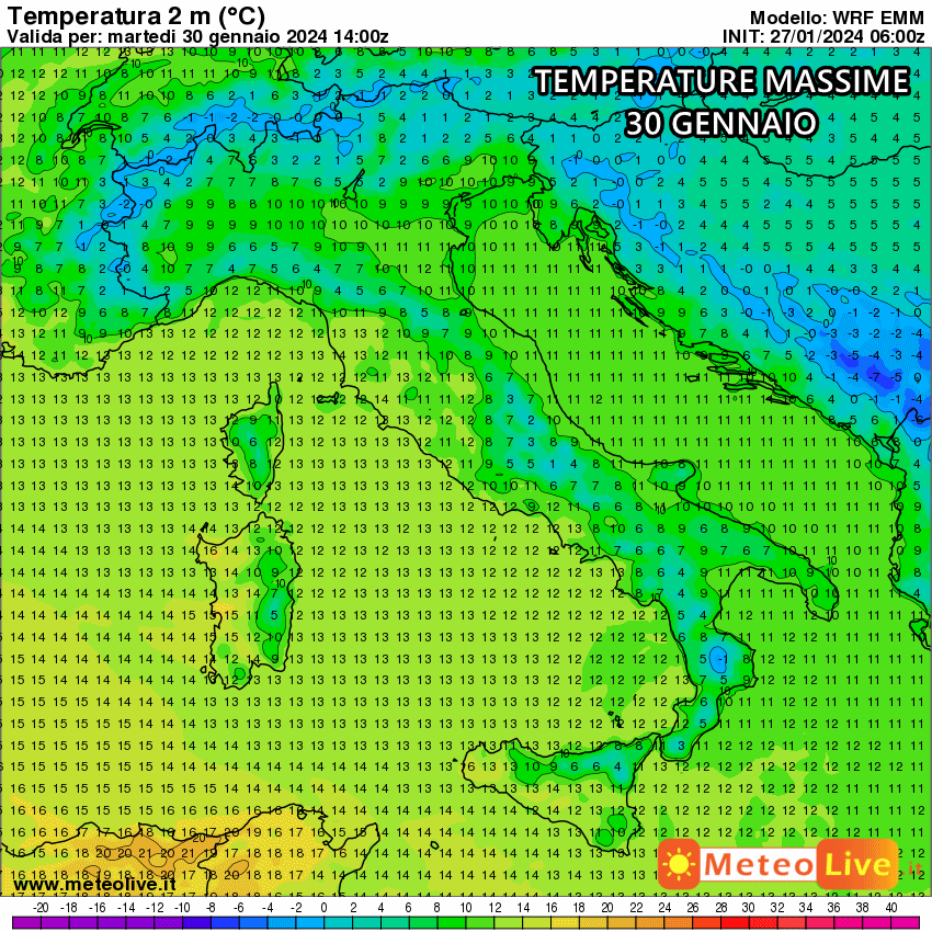 Martedì 30 gennaio: insiste l’anticiclone su tutta Italia, nessun segno d’inverno. Eloquente la mappa di previsione della pioggia fino a fine gennaio: rischia di non precipitare nemmeno una goccia d’acqua in tutta la penisola!