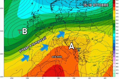 Sul finire della settimana, tra sabato e domenica, ecco che si concretizzerà un repentino cambio di circolazione dell’aria tra Atlantico ed Europa, già discusso in questo articolo. Una vasta saccatura fresca sprofonderà sull’Atlantico orientale lambendo l’Europa occidentale e marginalmente anche il nord Italia, mentre sul Mediterraneo centrale (e dunque anche su buona parte della nostra penisola) si rinforzerà l’anticiclone portatore di aria molto mite e stabile.