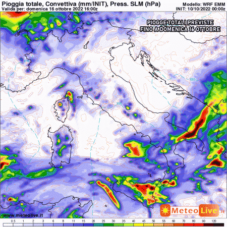 Giovedì 13 ottobre: maltempo diffuso su Sardegna, Sicilia e Calabria. Rischio marcato di temporali su Calabria centrale e Sicilia. Piogge deboli e sparse su Campania, Basilicata, Puglia. Stabile altrove. Temperature stazionarie.