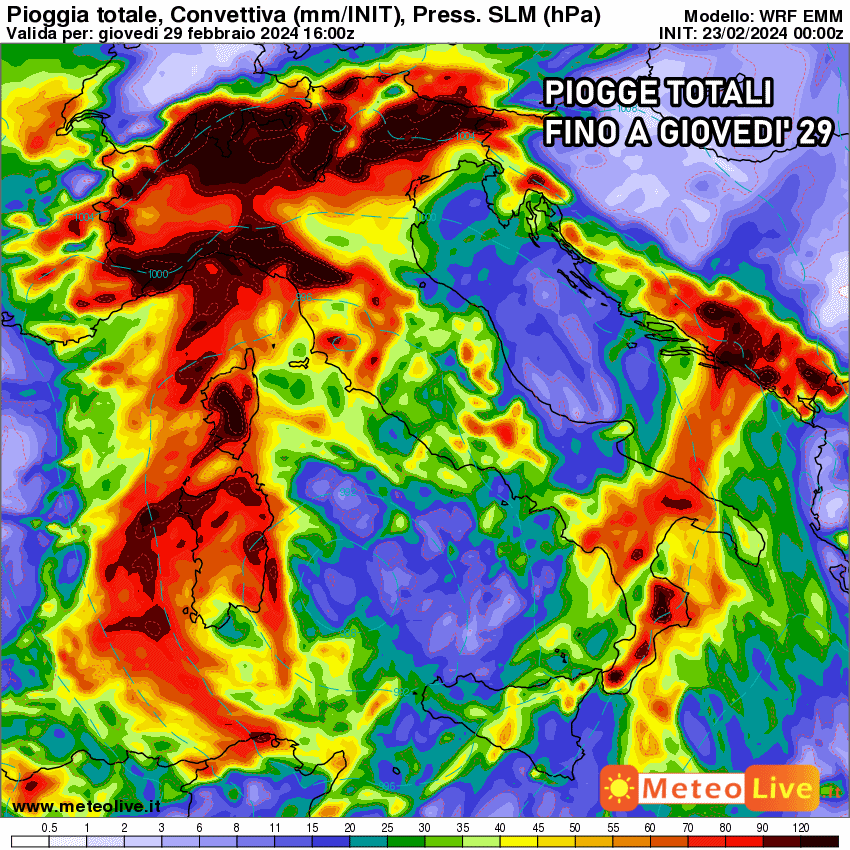 Giovedì 29 febbraio: finale del mese e dell’inverno meteorologico con un ciclone in risalita dal nord Africa. Venti intensi su tutto il centro-sud, piogge e temporali sul Meridione e centro Italia. Rischio nubifragi e mareggiate impetuose sul versante ionico.