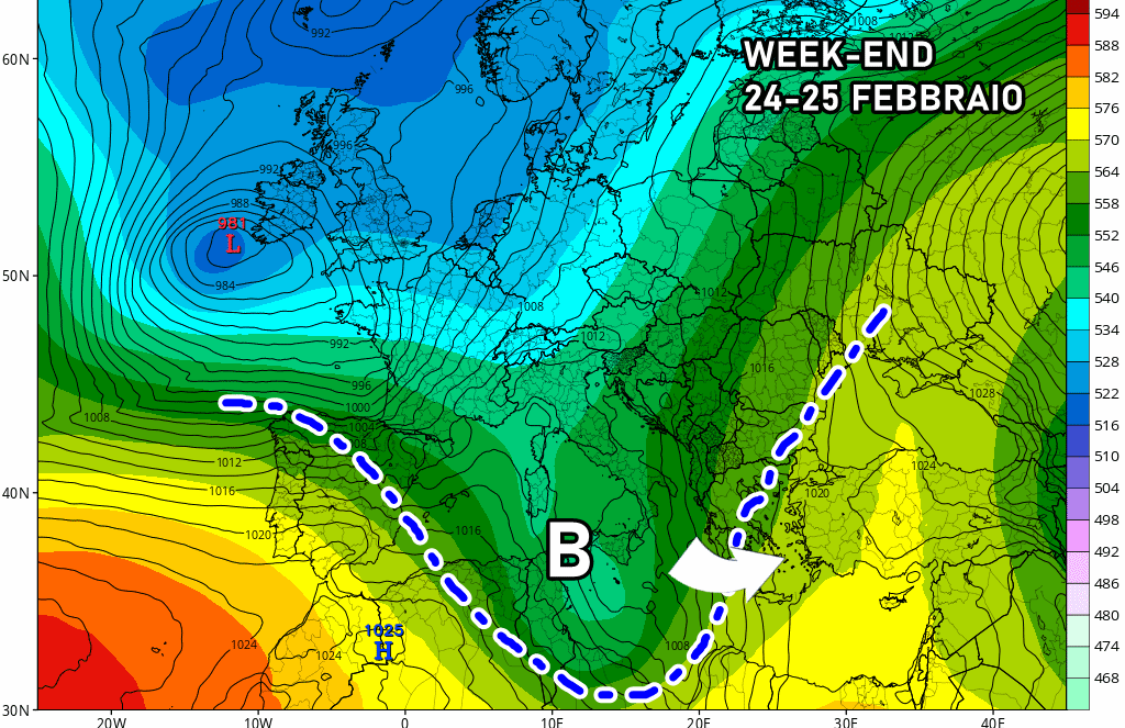 Sabato 24 febbraio: maltempo diffuso al centro e al sud, specie sul lato tirrenico. Instabilità sparsa al nord con neve oltre 1000 metri.