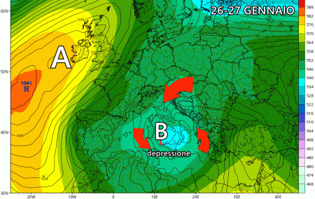 Giovedì 26 gennaio: depressione sulle regioni del sud con maltempo diffuso. Riscvhio nubifragi su Sicilia e Calabria. Neve in Appennino meridionale oltre 800 metri. Fiocchi anche sull’Appennino centrale. Più stabile al nord.