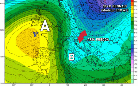 Martedì 31 gennaio: nuova irruzione fredda per il medio-basso Adriatico e il sud, nevicate fino in collina. Stabile e secco al nord e alto Tirreno. Temperature in netto calo.