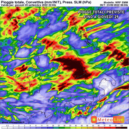 Domenica 25 settembre: temporali intensi su Toscana, Lazio, Sardegna, Campania settentrionale, in estensione ai settori adriatici centrali tra Marche, Abruzzo e Molise. Rischio nubifragi elevato. Maltempo disorganizzato al nord, più asciutto al sud. Temperature in aumento.