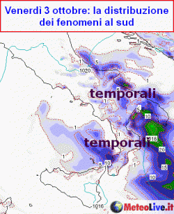 venerdì 3 ottobre: tempo ancora instabile al sud con temporali soprattutto su Calabria tirrenica, nord Sicilia, Puglia e costa lucana jonica, maggiori schiarite sulla Campania e nel sud della Sicilia. Al centro residua nuvolosità su basso Lazio ed Abruzzo ma con rovesci solo isolati e tendenza a miglioramento, bello sul resto del centro, abbastanza soleggiato anche al nord, salvo locali situazioni nebbiose durante la notte e nel primo mattino.