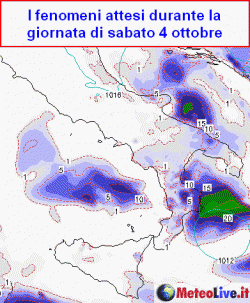 sabato 4 ottobre: al sud, specie su Puglia, Calabria jonica e Basilicata ancora instabile con locali rovesci o temporali, sulle restanti zone meridionali parzialmente nuvoloso ma asciutto, bel tempo al centro ed anche al settentrione, salvo modesti passaggi nuvolosi. Clima mite.