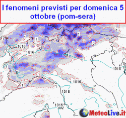 domenica 5 ottobre: all’estremo sud addensamenti residui con qualche occasionale rovescio ma con tendenza a miglioramento, al centro bel tempo, al nord dapprima bello, salvo locali foschie o nebbie, poi nubi in aumento sulle Alpi, la Liguria ed il settore occidentale con possibili piovaschi o brevi rovesci pomeridiani. Temperature in lieve calo al nord-ovest, in aumento altrove.