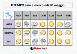 sabato 16 maggio: al nord nuvolaglia, residue piogge o rovesci con tendenza a miglioramento con il passare delle ore, instabile al centro con rovesci soprattutto in Sardegna e poi nel pomeriggio su tutte le zone interne peninsulari, tende a peggiorare anche al sud con rovesci sparsi e isolati temporali a partire dalla Campania, temperature in calo al centro-sud, in lieve ripresa al nord.