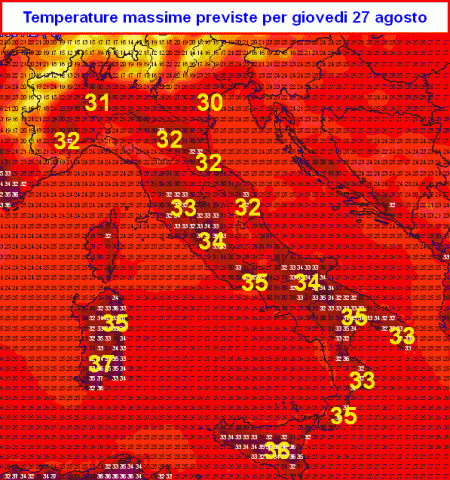 A tal proposito, vi mostriamo le temperature previste sulla nostra Penisola nel pomeriggio di giovedi 27 agosto: