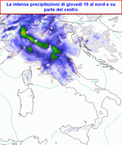giovedì 19: temporali al nord e poi al centro, esclusa la Sardegna. Fenomeni anche violenti, associati a locali grandinate e calo termico, tempo di attesa con schiarite al sud. Calo termico al nord e al centro.