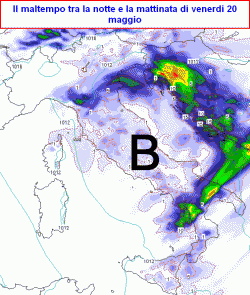 l’arco di un fronte occluso, esteso dalle Venezie al medio-basso Adriatico, le altre consisteranno in rovesci temporaleschi a macchia di leopardo sul resto del centro-sud, già migliorato il nord-ovest, saltata la Sardegna, pochi fenomeni anche in Sicilia.