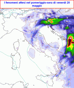 venerdì 20: migliora al nord-ovest, bello in Sardegna, rovesci su nord-est ed Emilia-Romagna, temporali a macchia di leopardo sulle centrali tirreniche, rovesci su Marche ed Abruzzo, Molise e Puglia, anche temporaleschi, instabile con rovesci sul resto del sud, sporadici sulla