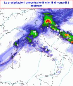 venerdì 2 febbraio: al mattino precipitazioni su nord-est ed Emilia-Romagna con quota neve in graduale abbassamento sino a quote collinari, schiarite al nord-ovest, piogge e temporali al centro, dapprima sul Tirreno, poi anche in Adriatico, nubi e piogge sulla Campania,