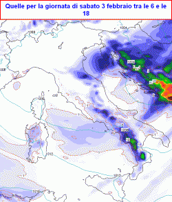 sabato 3 febbraio: neve su est Emilia e Romagna tra la mattinata ed il primo pomeriggio, neve sul Carso ma migliora, schiarite sul resto del nord almeno parziali, perturbato al centro con piogge e temporali, ma anche neve a quote collinari nelle prime ore su Toscana, Umbria e Marche, graduale miglioramento già dalla mattinata sulla Toscana, piogge su Campania e Calabria tirrenica, piovaschi su Molise, Puglia, pochi fenomeni in Sicilia. Temperature in calo.