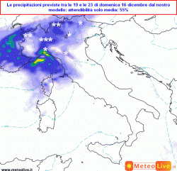 giovedì 20 dicembre: perturbato su nord, centro e Campania con precipitazioni diffuse, anche temporalesche sul Tirreno, nevose sulle Alpi oltre i 600-1000m, oltre i 1300m in Appennino. All’estremo sud generalmente asciutto. Temperature in aumento.