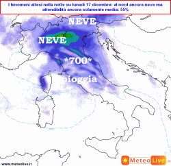 lunedì 17 dicembre: migliora al nord-ovest già dal primo mattino, ancora nubi e qualche precipitazione anche nevosa sul nord-est e l’Emilia-Romagna nelle prime ore, poi cessazione anche qui, al centro nuvolosità irregolare e qualche precipitazione sparsa, nevosa oltre i 1000m, al sud instabile con qualche rovescio passeggero, generale miglioramento dal pomeriggio.