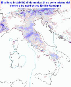 domenica 24 luglio: sereno al nord-ovest, instabilità su nord-est, Emilia-Romagna e resto del centro con brevi temporali, specie nel pomeriggio e a ridosso delle montagne, isolati temporali anche lungo la dorsale appenninica del meridione. Temperature senza grandi variazioni al nord-ovest, in calo lieve o moderato tra nord-est e centro, in lieve calo anche al sud, specie nella notte su lunedì.