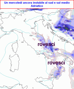 Mercoledì instabilità su medio Adriatico e meridione, giovedì tendenza a miglioramento e bello ovunque sino a sabato mattina, poi nuvolaglia su gran parte d'Italia e piogge domenica su Sardegna, nord-ovest e parte del centro. Tra lunedì e martedì afflusso temporaneo di aria calda al centro-sud, ancora maltempo sul nord-ovest, anche severo.