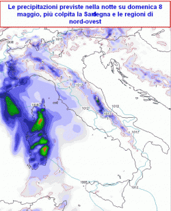 sabato 7 maggio: nuvolaglia stratiforme alla conquista dell’Italia con anche sabbia in sospensione, qualche piovasco sulle zone appenniniche, Sardegna, forse nord-ovest, temperature in calo, specie al nord.