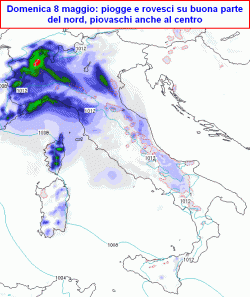 domenica 8 maggio: molto nuvoloso tra nord, centro e Sardegna con fenomeni soprattutto sul nord-ovest, l’isola e la dorsale appenninica del centro, parzialmente nuvoloso al sud con isolati piovaschi, clima mite, un po’ più fresco solo al nord.