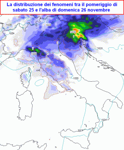 sabato 25 novembre: passaggio di una perturbazione al nord e sulla Toscana con piogge sparse in movimento da ovest verso est e brevi nevicate sulle Alpi oltre i 1500m, entro sera coinvolgimento anche di Umbria e Lazio, attenuazione dei fenomeni all’estremo nord-ovest. Sulle altre regioni parziale aumento della nuvolosità ma tempo asciutto e ancora un po’ di sole. Temperature in calo nelle aree soggette a precipitazioni.