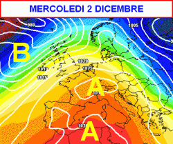 La prima cartina, valida per mercoledì 2 dicembre ci mostra l’anticiclone placidamente adagiato sul Mediterraneo. Le perturbazioni sono costrette a fare "il giro largo", evitando accuratamente il contatto con questa isola di stabilità che ingloba gran parte del nostro Continente.
