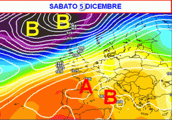 Se con un balzo virtuale ci spostiamo a sabato 5 dicembre (seconda cartina a lato), si nota un cedimento pressorio sull’Italia. Una perturbazione abbastanza "scalcinata" proverà a forzare il blocco indotto dalla struttura stabilizzante, ma i risultati sul nostro Paese non saranno esorbitanti.