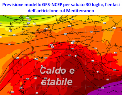Nei prossimi giorni una figura vistosa di alta pressione dalle origini africane, comporterà una cessazione dei fenomeni d'instabilità termoconvettiva che ci hanno interessati in queste ultime giornate. Caldo intenso soprattutto nelle zone interne, poi un po' di instabilità in arrivo al nord tra lunedì primo e martedì 2 agosto, in seguito ancora anticiclone.