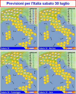 Sabato 30 – domenica 31: caldo intenso nelle zone interne con valori superiori ai +35°C, caldo afoso lungo le coste. Ventilazione debole, mari calmi.