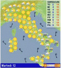 MARTEDI 12 MARZO: bel tempo, ma più freddo, al nord e sul Tirreno; instabile in Adriatico e al meridione con rovesci e nevicate in Appennino sopra i 500-700 metri. Clima ventoso. Entro sera migliora quasi ovunque.
