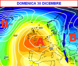 Se ci spingiamo fino a domenica 30 dicembre (seconda mappa) notiamo che la situazione farà pochi passi avanti; l’aria fredda presente sull’Europa orientale tenderà ad avvicinarsi alla nostra Penisola, ma non riuscirà ancora ad impensierire la "macchina scaccia inverno" comandata dal vasto pachiderma anticiclonico ubicato sull’ovest del Continente.