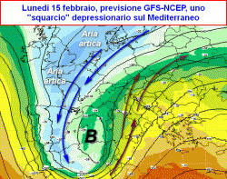 Domenica 14 – lunedì 15: importante circolazione di bassa pressione porta condizioni di MALTEMPO al centro ed al nord. La giornata più compromessa lunedì 15. Quota neve sino a 400-600 metri su Alpi e Prealpi, 800-1000 metri sull’Appennino settentrionale, più elevata altrove. Ventilazione di Scirocco in rinforzo specie al centro-sud, dove le temperature saranno in aumento, lieve diminuzione al nord. Rinforzi di Tramontana su Liguria, possibile Grecale/Bora su alto Adriatico.