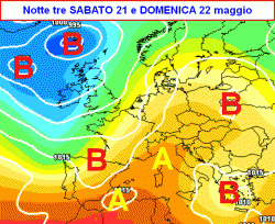La prima mappa previsionale, valida per la notte tra sabato 21 e domenica 22 maggio, ci mostra una blanda zona di alta pressione situata sull’Italia. Si nota inoltre la vecchia depressione in allontanamento verso levante (che darà ancora qualche temporale al sud nella giornata di sabato) e una nuova figura di maltempo sul nord Atlantico che invierà qualche temporale al nord nel pomeriggio di domenica.