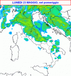 I temporali che si faranno strada domenica al nord saranno l’anticamera di un nuovo peggioramento che diverrà realtà su buona parte del Paese nella giornata di lunedì 23 maggio (seconda mappa).