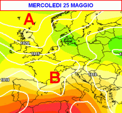Volgendo lo sguardo a prua e arrivando alla giornata di mercoledì 25 maggio (terza mappa), si nota una situazione meteo ancora non ottimale sulle regioni centro-settentrionali italiane.