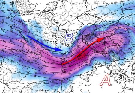Analisi in quota del modello americano riferita alla notte tra mercoledì e giovedì, in cui si osserva una nuova ondulazione del getto al piano isobarico di 500hPa (circa 5500 metri):