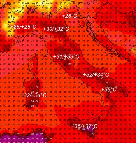 La forte ondata di caldo che da molti giorni interessa le regioni del sud Italia, lascerà spazio a delle temperature un po’ più clementi. Questa settimana l’alta pressione africana perderà qualche punto rispetto alle correnti oceaniche, le quali riescono già adesso e riusciranno anche nei prossimi giorni, a portare un parziale rimescolamento dell’aria anche sul nostro Paese. Le temperature al nord e su buona parte del centro sono già scese nei valori medi del periodo, tra giovedì e venerdì un modesto calo della temperatura si farà sentire anche al sud. Stima delle temperature MASSIME previste dal modello americano per venerdì 6 agosto: