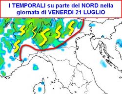 Al nord entrerà in scena qualche temporale, specie nella giornata di venerdì 21 (prima mappa), che interesserà le Alpi, le Prealpi e le zone di pianura poste a nord del Po. Sulle altre zone i fenomeni saranno meno probabili anche se sarà presente una maggiore nuvolosità, comunque non apportatrice di cali termici considerevoli.