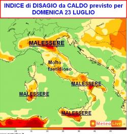 Durante il prossimo week-end salirà anche l’indice di disagio da caldo che vediamo schematizzato nella seconda mappa inerente al pomeriggio di domenica 23 luglio.